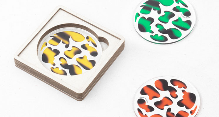 The Artist collection is made from recycled and recyclable methacrylate. We use this material for all the products described below: magnets, bookmarks, coasters, pins, keychains, and placemats. They all feature graphic illustrations of iconic artists who have had an impact on the art world. Vibrant colours, pop aesthetics, and simple lines create the illustrations that have been applied to different products, generating a collection of “artist series.” If you’re interested in having an interpretation of your favourite artist designed, just let us know!