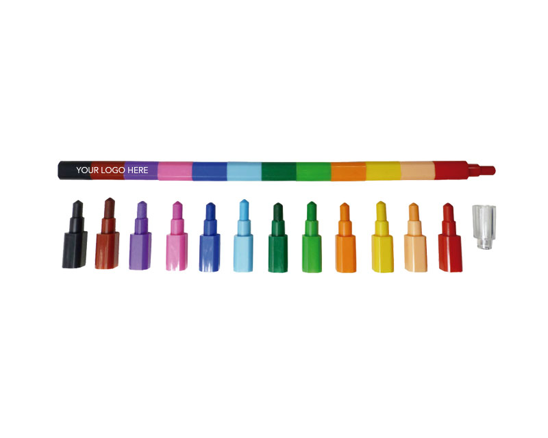 Interchancheable and removable 12 different color pieces of wax pencil. With clear plastic cap. Logo printed on pad printing.
