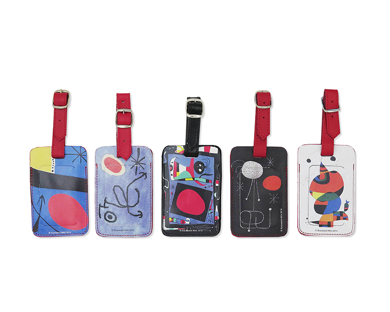 100% Bovine leather luggage tags with Miro works and data window. Leather strip to hang up to the luggage. Presentation in individual transparent bag. Sticker label with credit works.