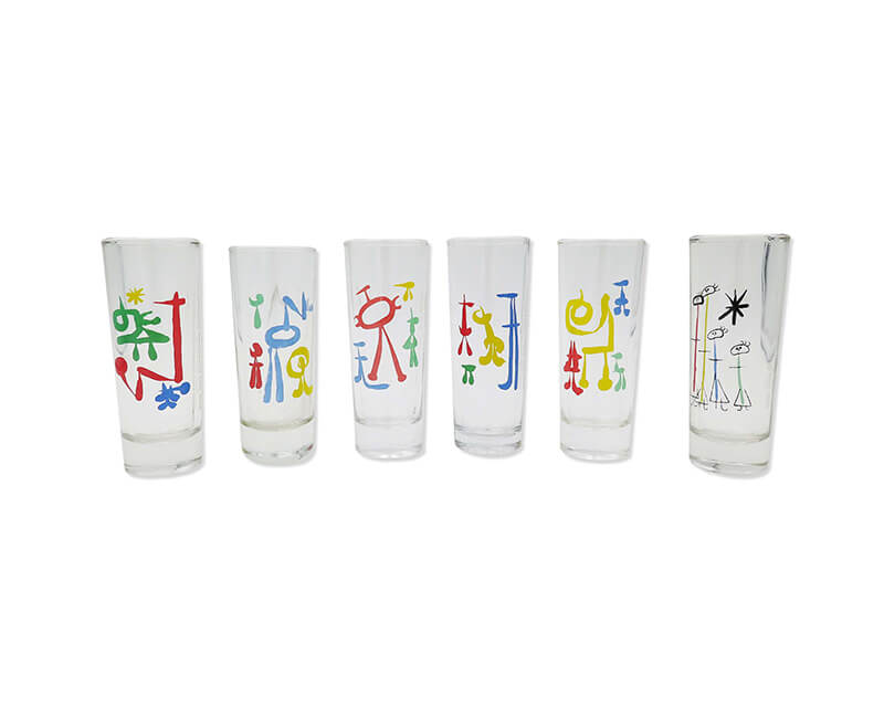Long shot transparent glasses with Miró images of the work Parler seul 1948-50. You can choose individual glasses or a pack of 6.