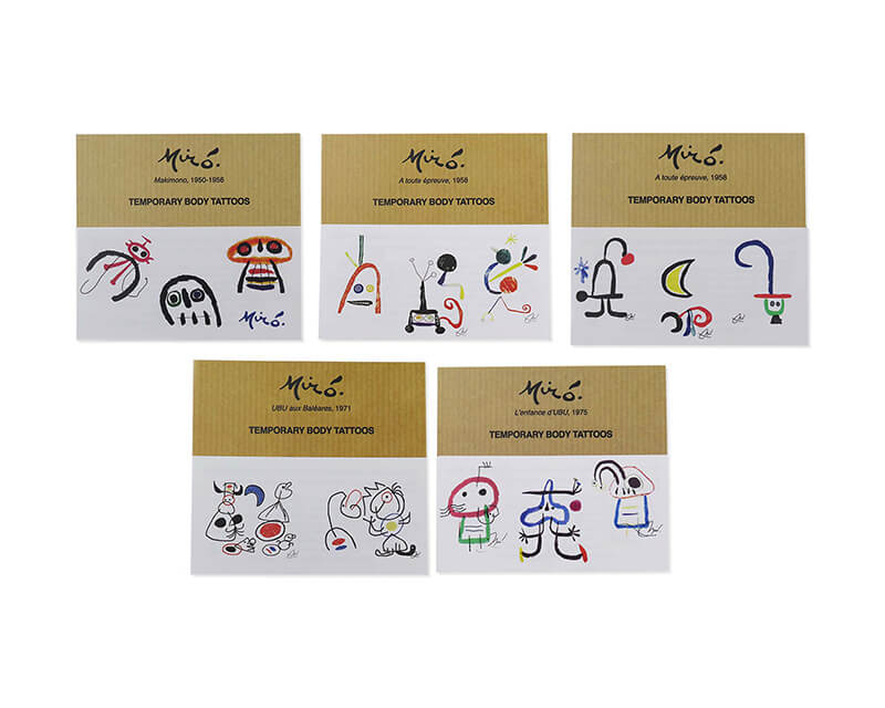 Bright colored temporary tattoos with artwork by Joan Miró. Inside a transparent envelope with hanging hole. Cardboard with artwork information and tattoo application instructions. Presentation transparent plastic envelope with adhesive opening and information cardboard.