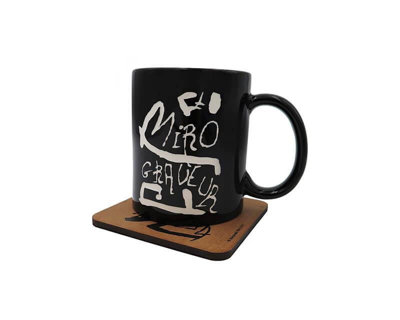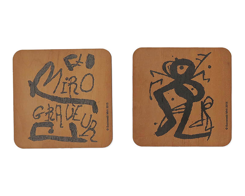 Cherry-tree two siders plywood coaster. Personalized on the upper side printed digitally at full color. Presentation in a set of 2 coasters with a Kraft paper strap, printed at 1-color. Design of woodcuts for Miró Graveur.