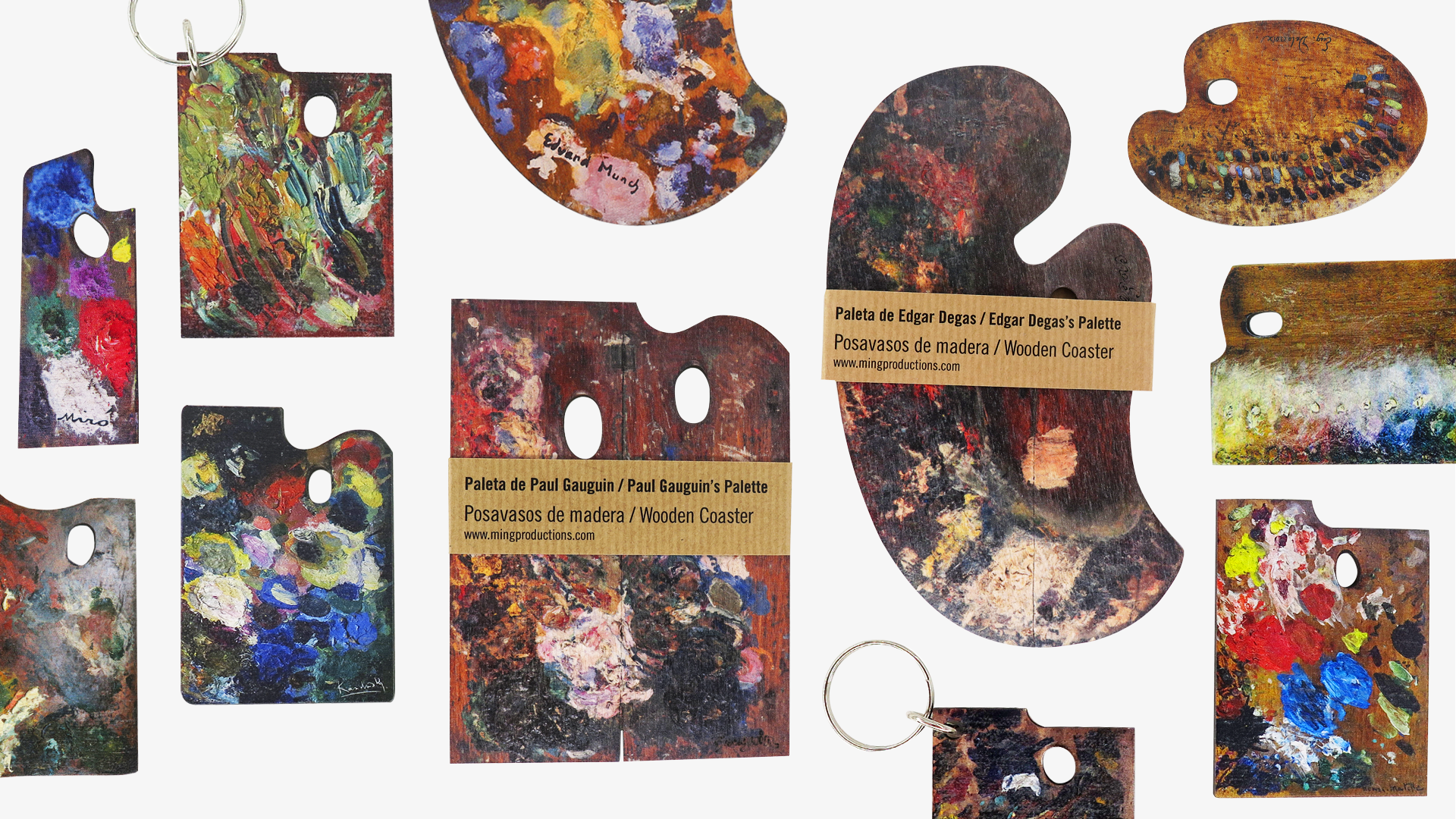 El punto principal de esta colección es la paleta, una de las herramientas más cruciales de un artista. Inspirados en las diversas formas y colores vibrantes que se encuentran en las paletas de varios artistas, hemos creado una serie de llaveros, imanes y posavasos. Los productos están hechos de madera y están fabricados en Europa.