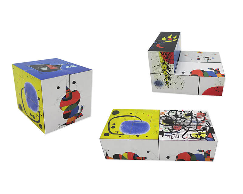 Juego Rompecabezas Art-Cube. 8 cubos unidos que conforman una sola pieza y al jugar aparecen 9 imágenes diferentes de Joan Miró. Presentación en caja de cartón impresa a todo color. Folleto acordeón con imágenes y textos en el interior. Imágenes de A Toute Épreuve 1958, Autoportrait II 1938, L’or d’azur 1967, Femme, Oiseau, Étoile 1966, Càntic del Sol 1975, Soleil et vent 1962, Femme et oiseau ou léver du soleil 1946, Mai 68 1968-1973 y Femme, oiseau, étoile 1978.