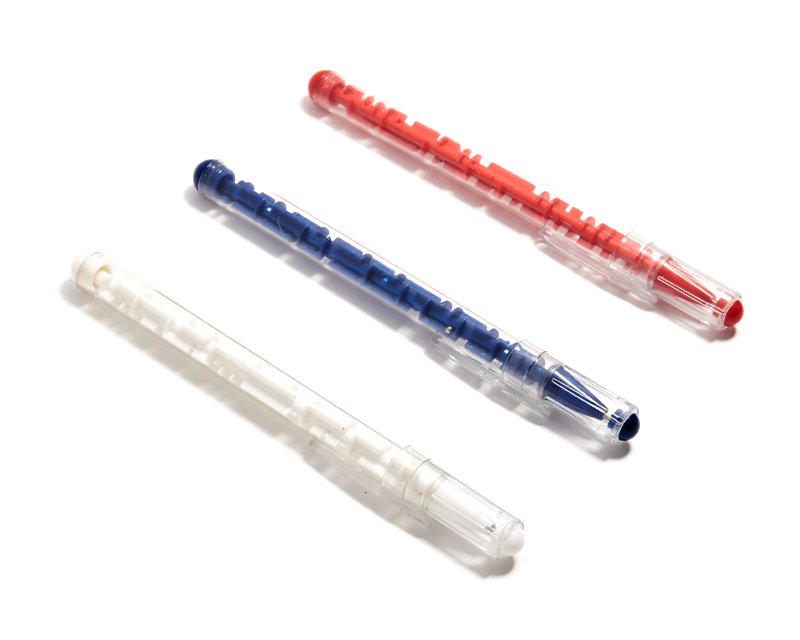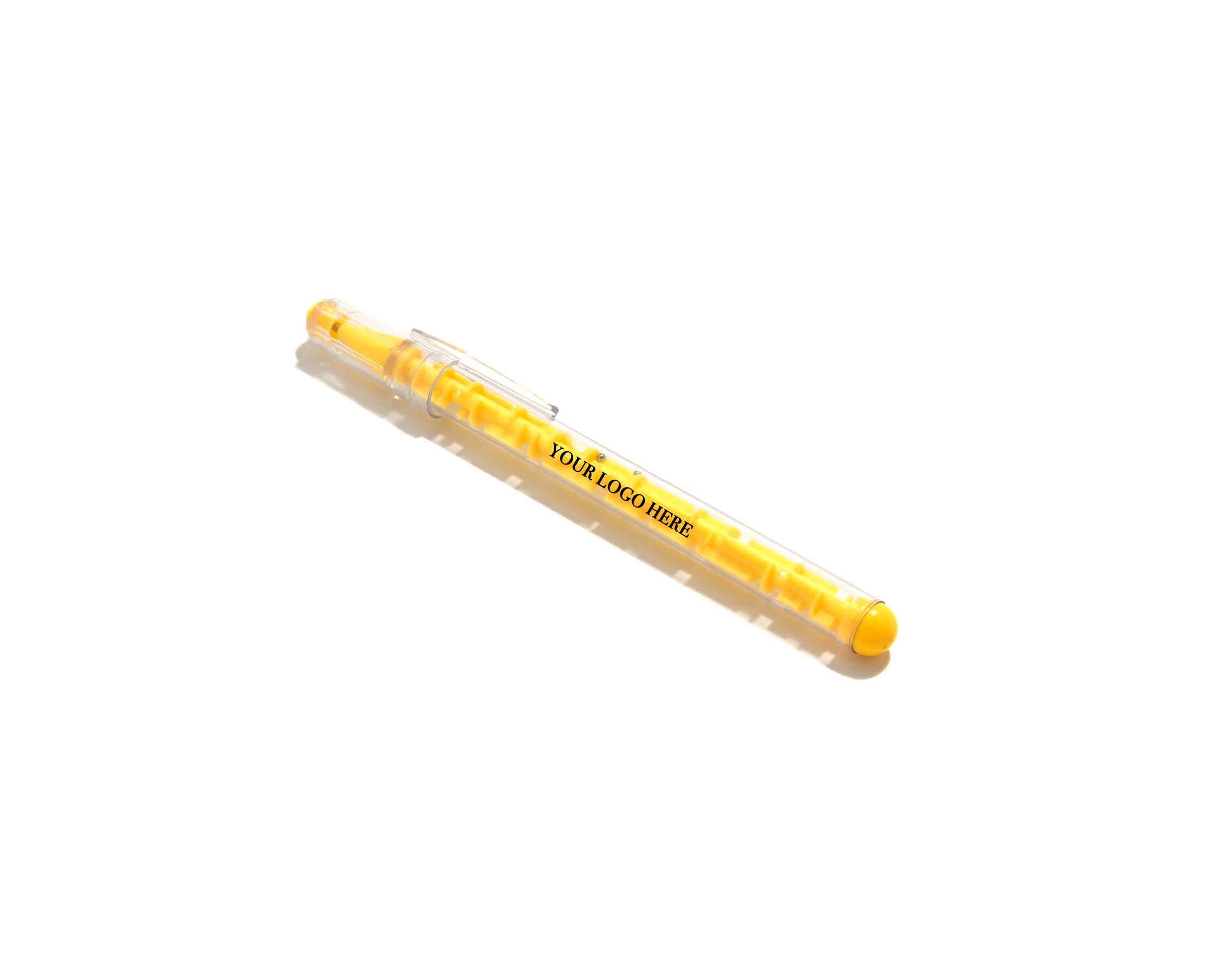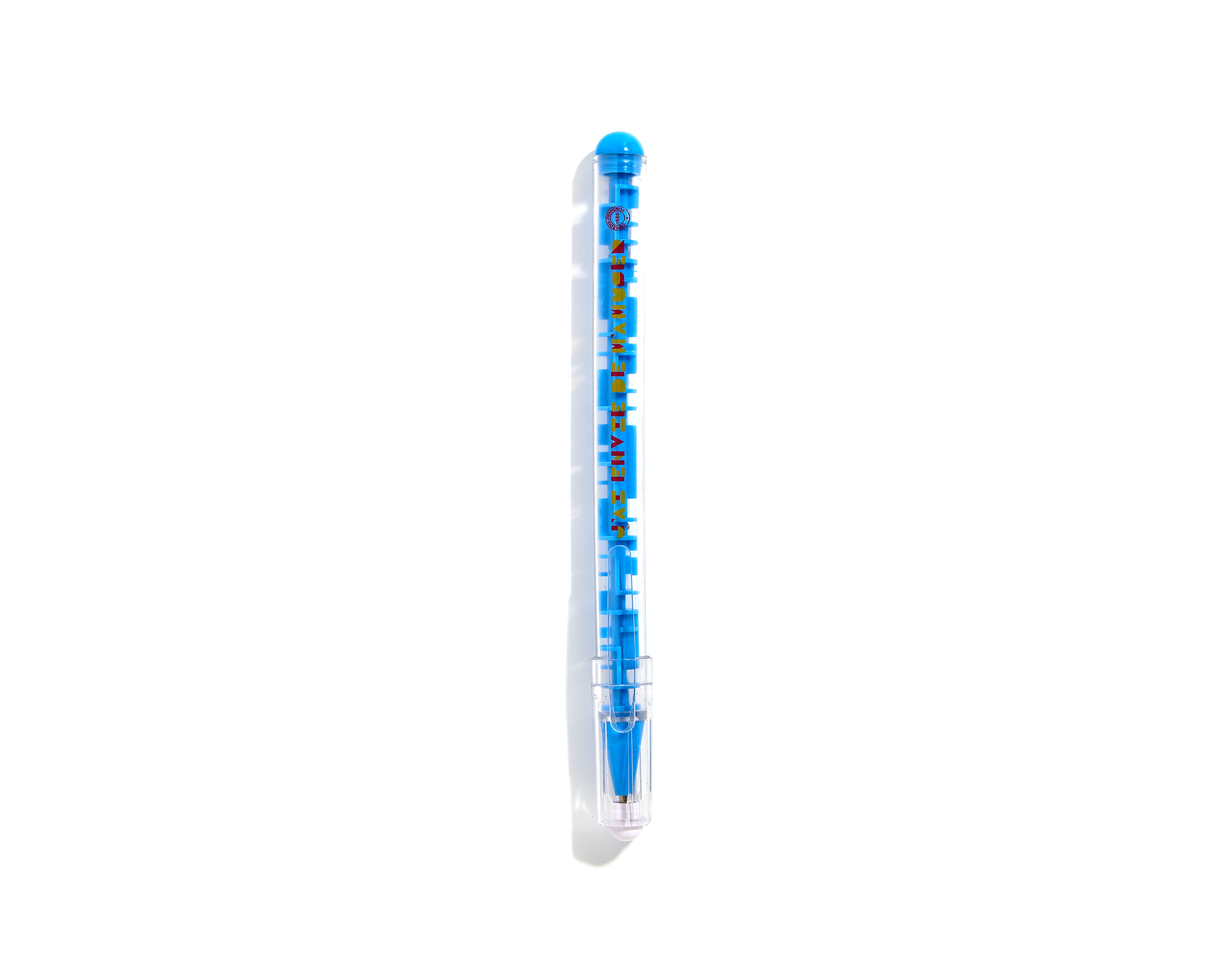 Bolígrafo de plástico transparente con capuchón. Contiene dos pequeñas bolas de acero en el interior para jugar en el laberinto.