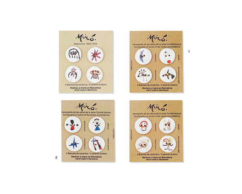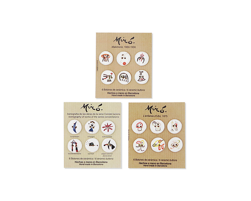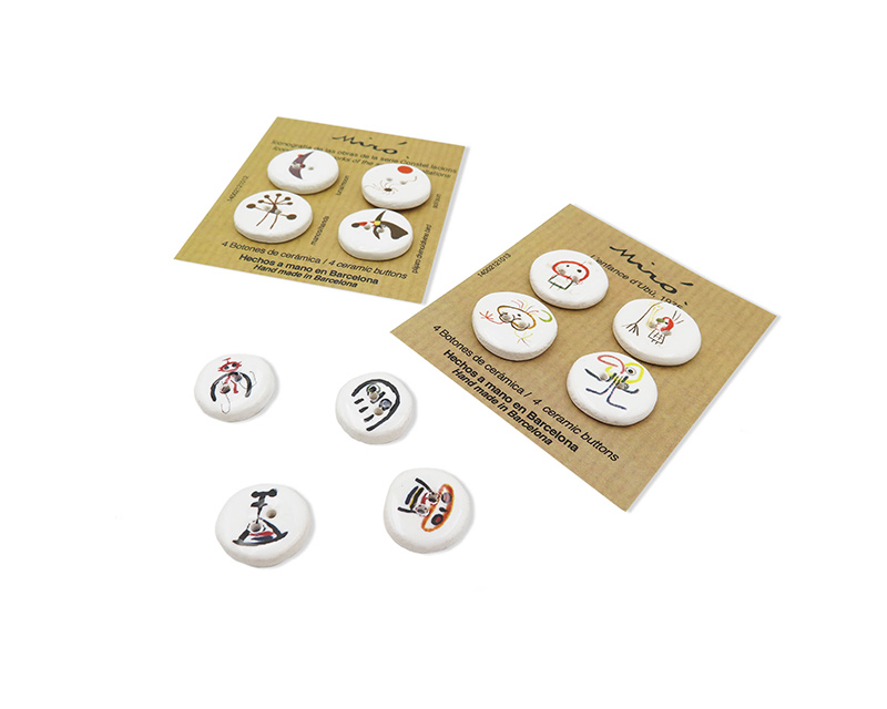 Botones de cerámica hechos a mano, personalizados con distintas obras de Joan Miró. Hay opción de tamaño grande en pack de 6 o pequeño en pack de 4.
