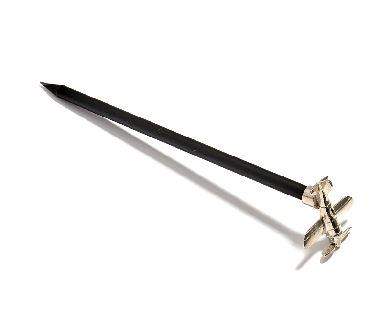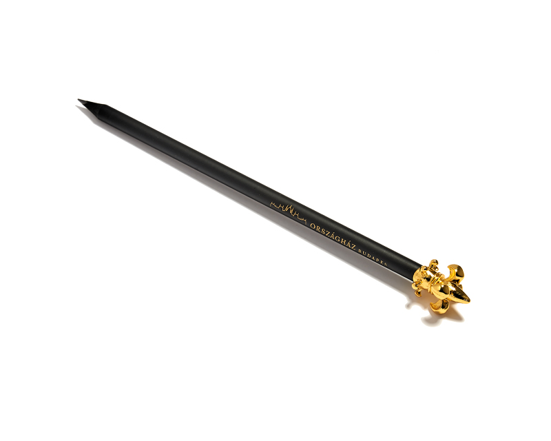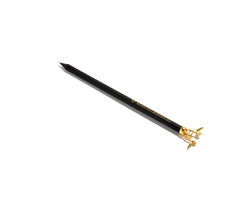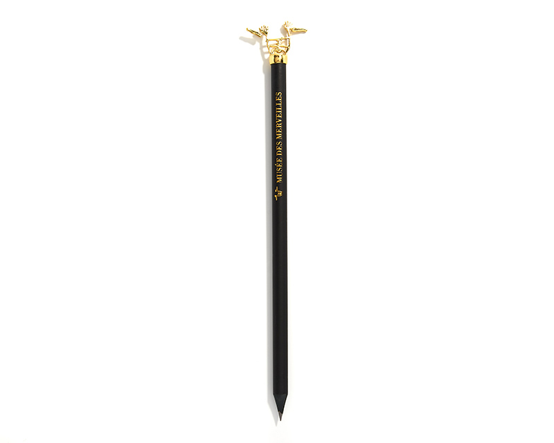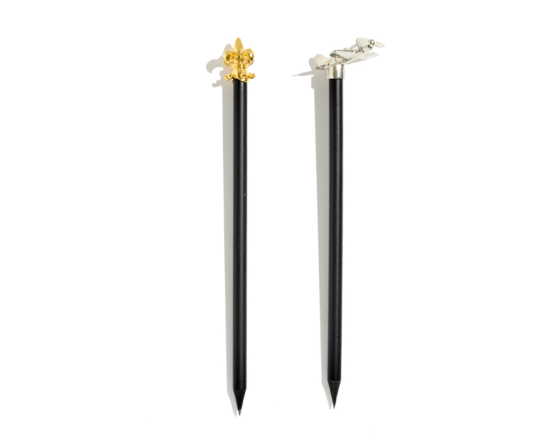 Lápices de madera negra con figura personalizada en la parte superior. La figura está hecha a metal y puede ser en color oro o plata, entre otros.