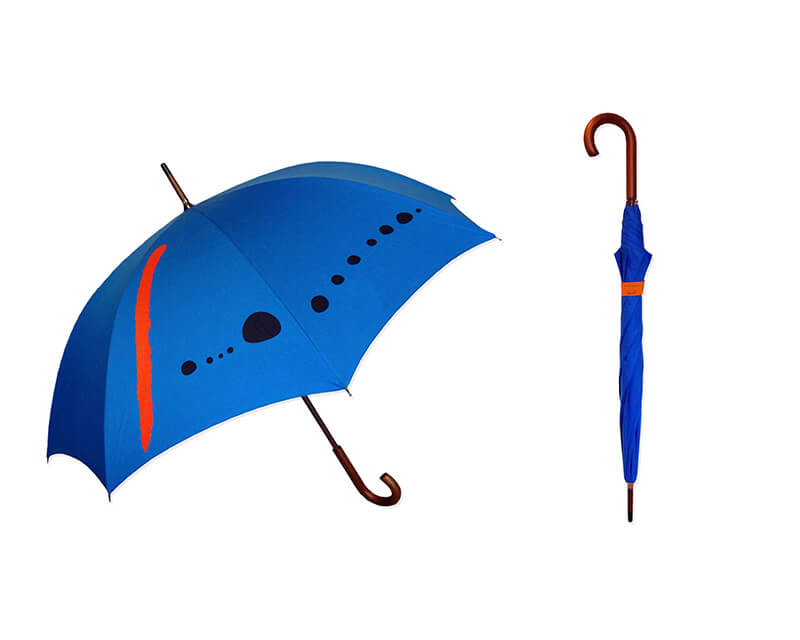 Paraguas de alta calidad con imagen de Miró. Diseño de paraguas clásico de la obra Bleu, II 1961, con punta reforzada, mango y cuerpo de madera y tela de algodón impermeable. En la tira de cierre figura el nombre de la obra. Hecho artesanalmente en España.