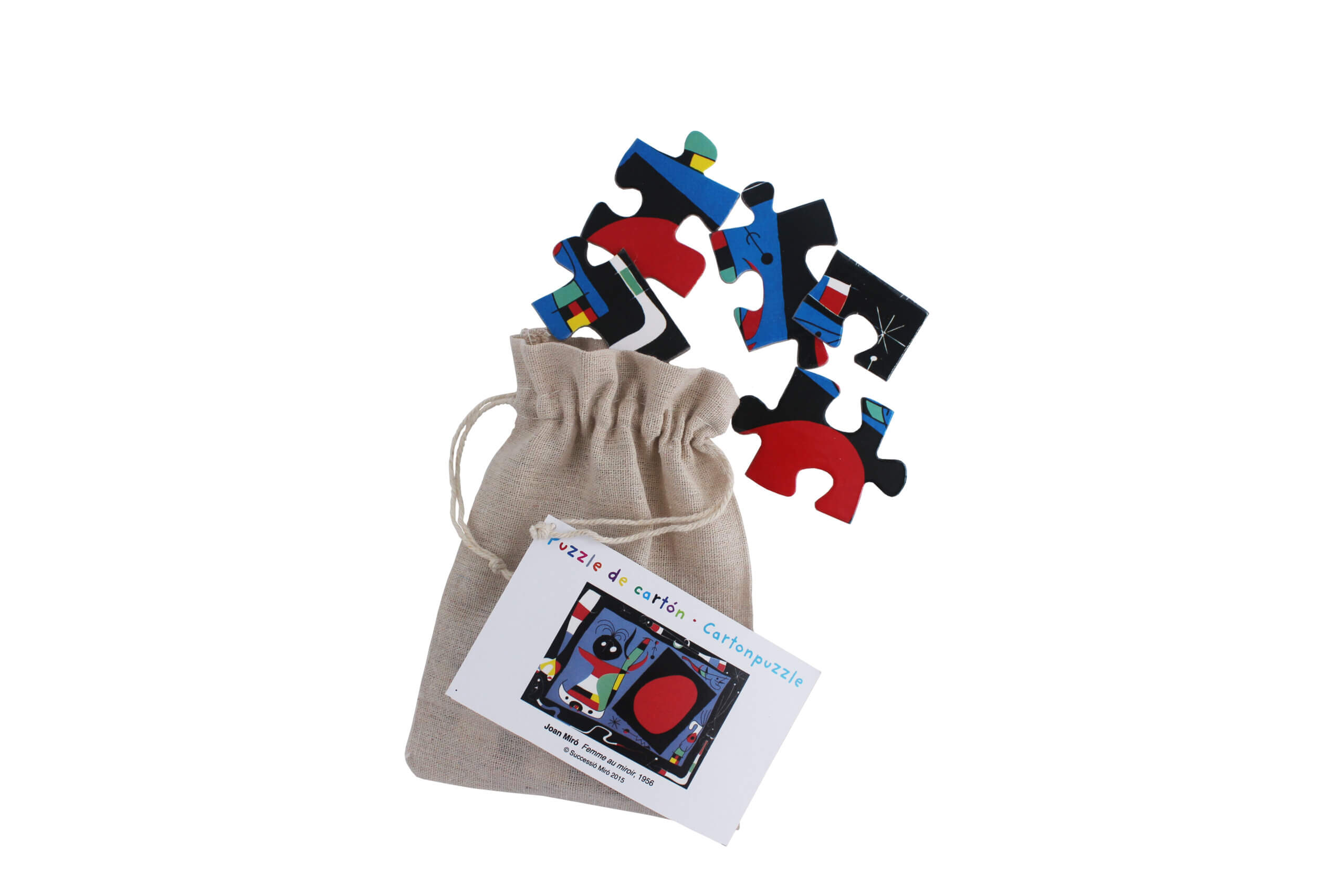 Puzzle con imágenes de Miró impreso a todo color sobre cartón. Compuesto por 20 piezas grandes en una bolsaestuche de plástico transparente y con un tarjetón en el interior con la imagen completa.
