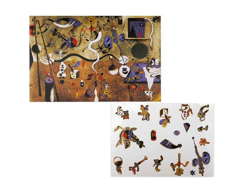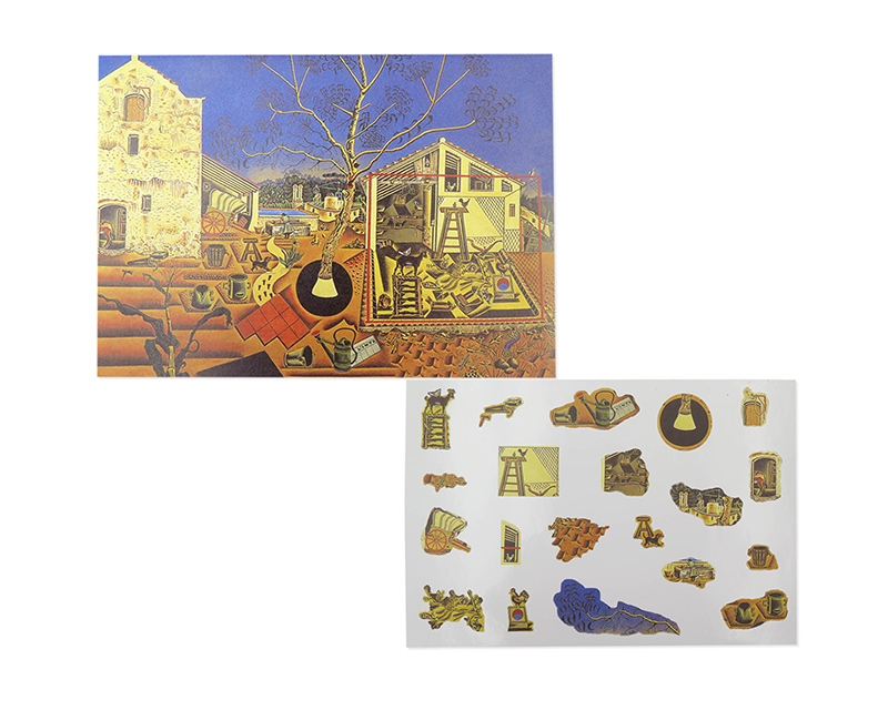 Juego/Set de stickers para completar como un puzzle la obra impresa. Folleto doblado A5, en la portada la imagen completa y en el interior imagen solo del fondo. Stickers de vinilo impreso y troquelado para pegar y componer el cuadro.